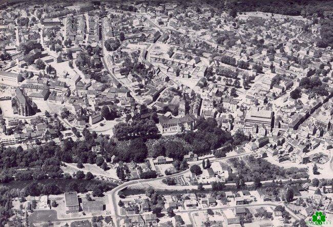 Een foto uit 1960 toont ons de zwanenstad in vogelvlucht. Als je van puzzelen houdt, kun je proberen de Schwanenburg, de Stiftskirche of de Kaufhof te ontdekken. Of het stadhuis. Nee, onzin, het bestond toen niet, maar je kunt de toekomstige bouwplaats aan de Lohstätte vinden. Waar? Linksonder.